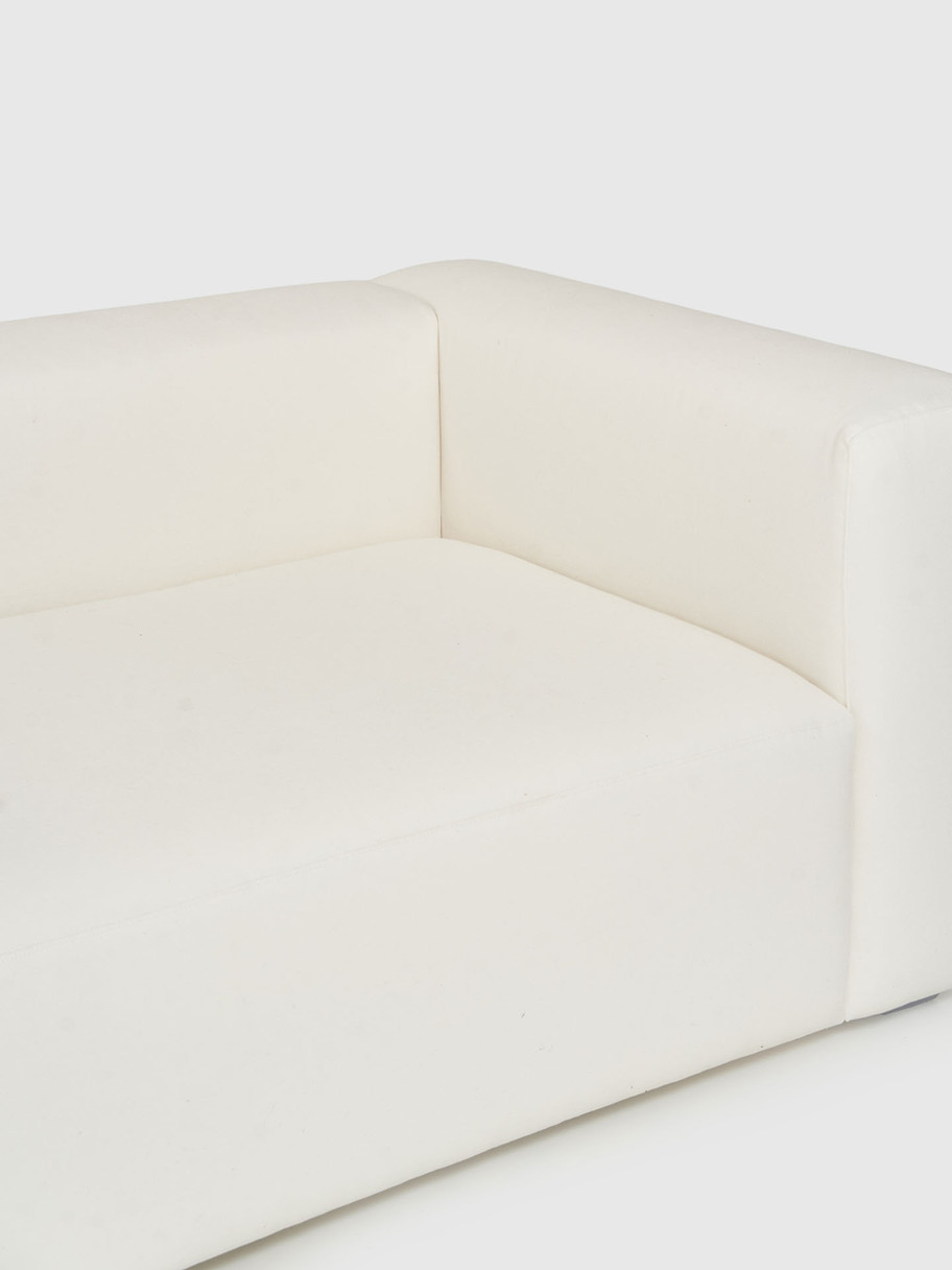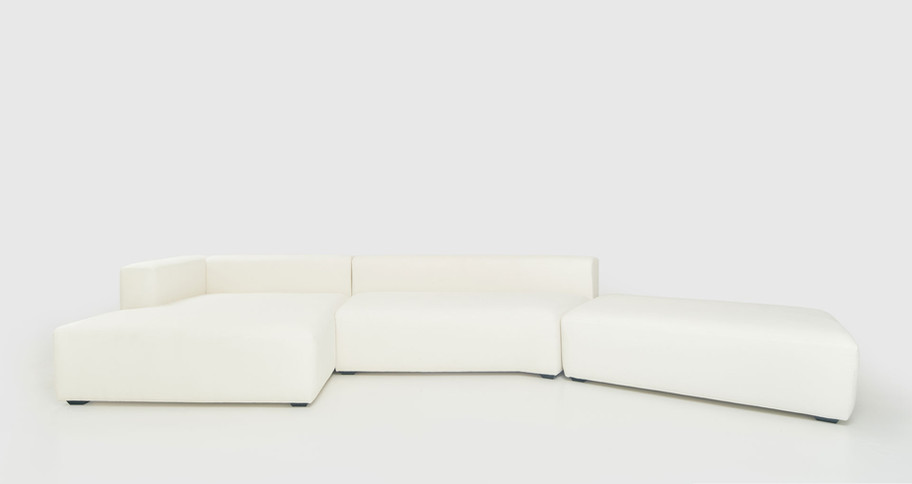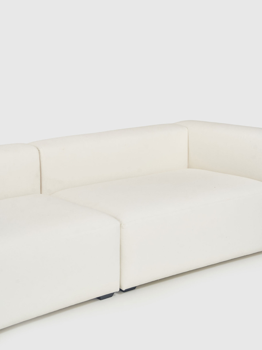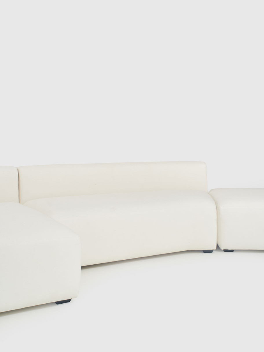 Sistema modular de sofás tapizados en lino algodón, pensado para armar composiciones a medida del espacio. Cada módulo cumple una función específica dentro del conjunto: iniciar o cerrar con apoyabrazos, extender con solo respaldo, completar con rectángulo libre o cuadrado, y resolver esquinas con módulo curvo.